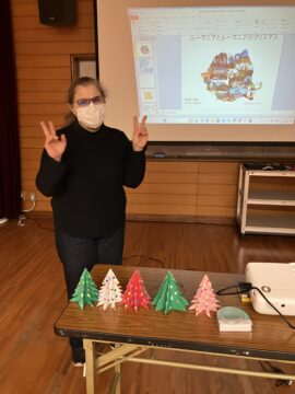 講師は、TIFAメンバーやカフェサパナではすっかりおなじみのマリアさんです。1年生から4年生の約25人の子供たちは珍しいお話にすっかりくぎ付け。ルーマニアのダンスで盛り上がった後は、みんなでクリスマスツリーのペーパークラフトを楽しみました。