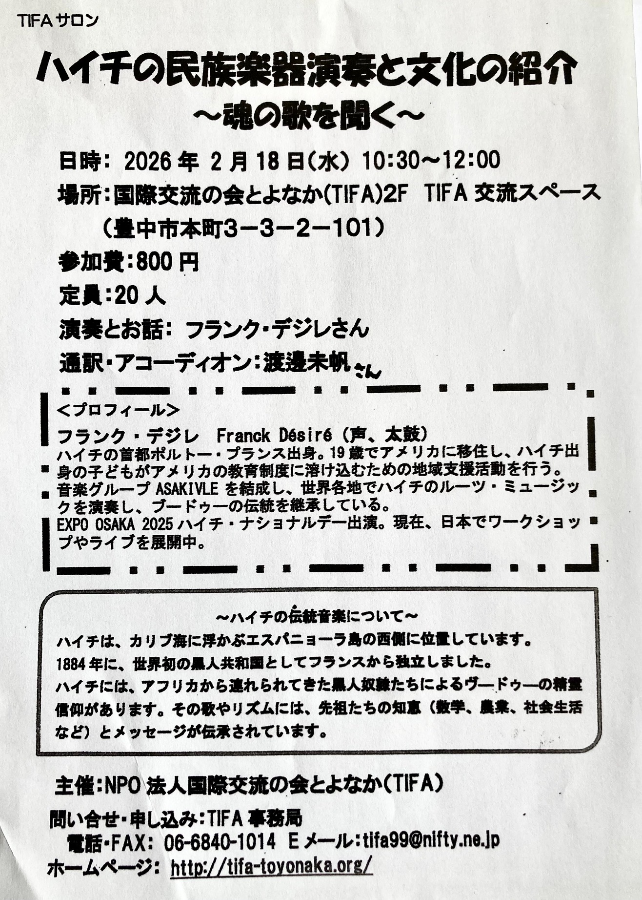 TIFAサロン ハイチの民族楽器演奏と文化の紹介~魂の歌を聞く~
