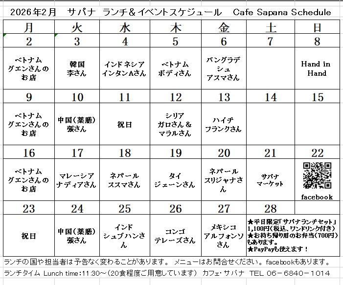 Cafe Sapana 2026年2月のスケジュール
